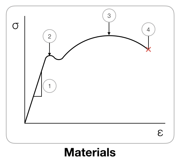 - Yield Strength: Max limit of stress the material can endure so that the material with still stretch elastically